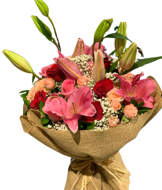 Lilly,Chrysantimum, Eryngium, Rose yellow, Rose white, Lepidium, Rice Flowers, Baby Rose